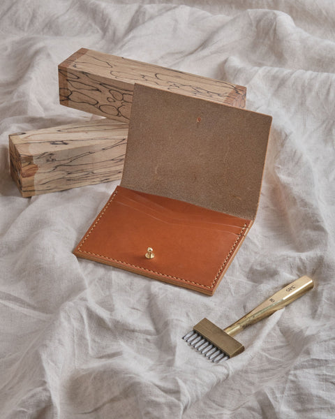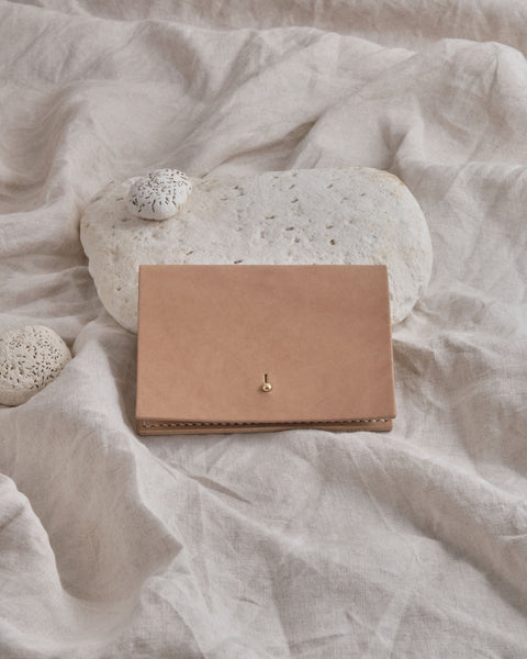 Pictured is the Small Wallet in Sand with white stitching and a brass fixing.
